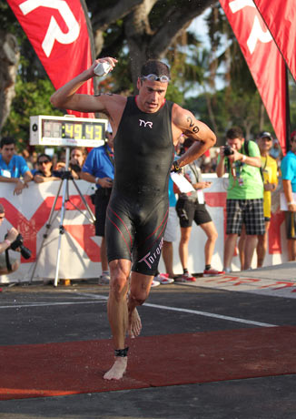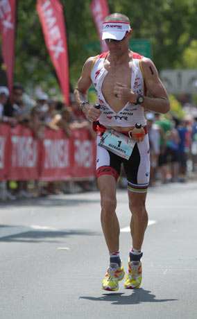 14:39 Australian Pete Jacobs crosses the beautifully decorated finish line in second place with a 2:42:29 run split, the fastest of the day. (Mark Allen's 2:40:04 from the 1989 battle with Dave Scott stays intact, as does Dave's second fastest ever run of 2:41:02, also from the 1989 epic.)