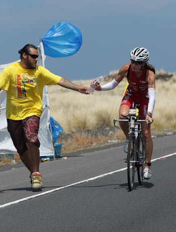 12:06 Karin Thürig of Switzerland collects a fresh water bottle. Her bike split of 4:44:20 is a new bike course record, and a solid one. She would finish sixth woman overall. (Note that statistically she held the old bike course record, as well, but with a "soft" time that did not include T1 and T2 times. Paula Newby-Fraser's 4:48:30 from 1993 did.)