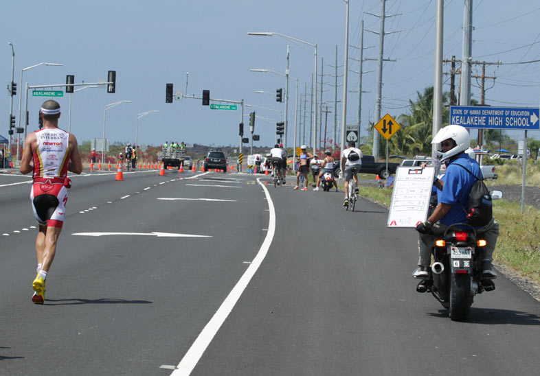 13:07 Once on the Queen Kaahumanu proper, Crowie gets into the groove and begins to stabilize his run lead and then pull away. The ever eminent split-provider Eric Gilsenan on the motorcycle shows that he is 2:35 ahead of a hard charging Andreas Raelert.