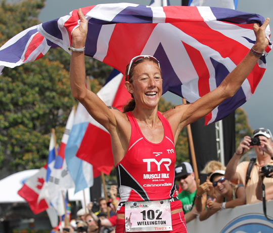 08:47 British triathlete Chrissie Wellington all alone on the lava way behind the leaders, a most unusual sight.