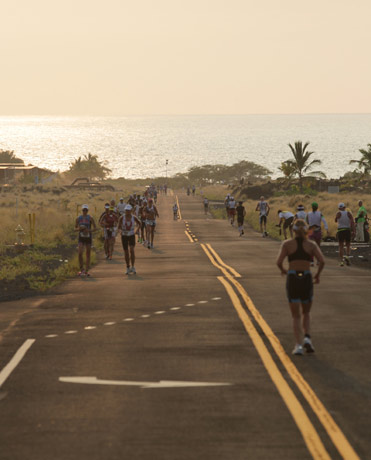 17:34 Age group athletes on the road from Nellie up to the Queen Kaahumanu some 40 minutes before sunset.