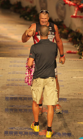 23:33 With less than half an hour to the midnight cut-off, original third-place Ironman Dave Orlowski is greeted by the three-time Ironman Champion and new course record holder Craig Alexander. Such is the tradition in Kona that the top finishers will come back and welcome the late arrivals and be part of the post-midnight ceremony. Chrissie and Mirinda were there too, of course, and wouldn't miss it for the world.