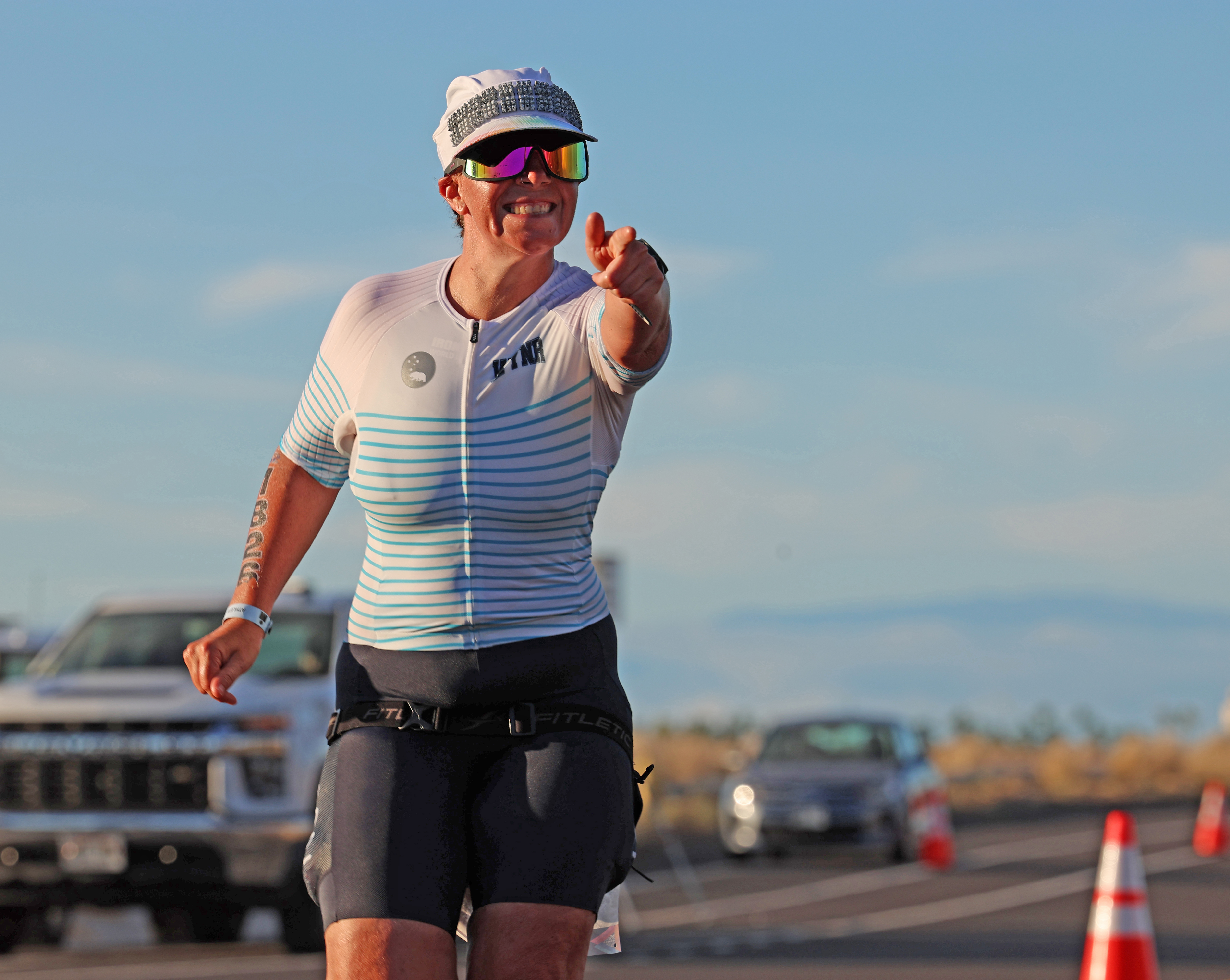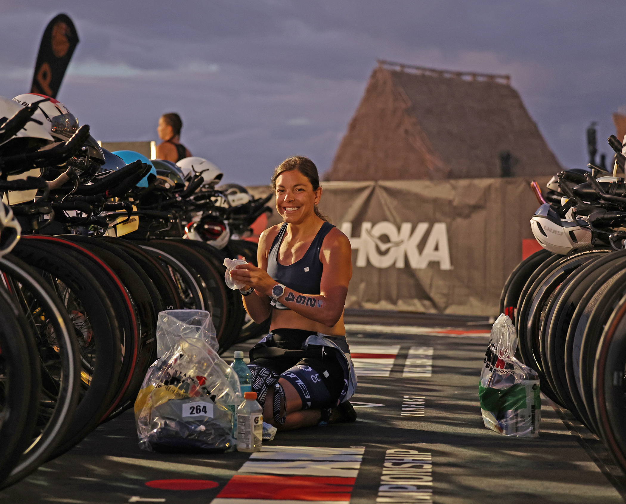 Multiple IRONMAN finisher and mom of twins Jacqui Giuliano of Illinois, prepares her gear with a smile.