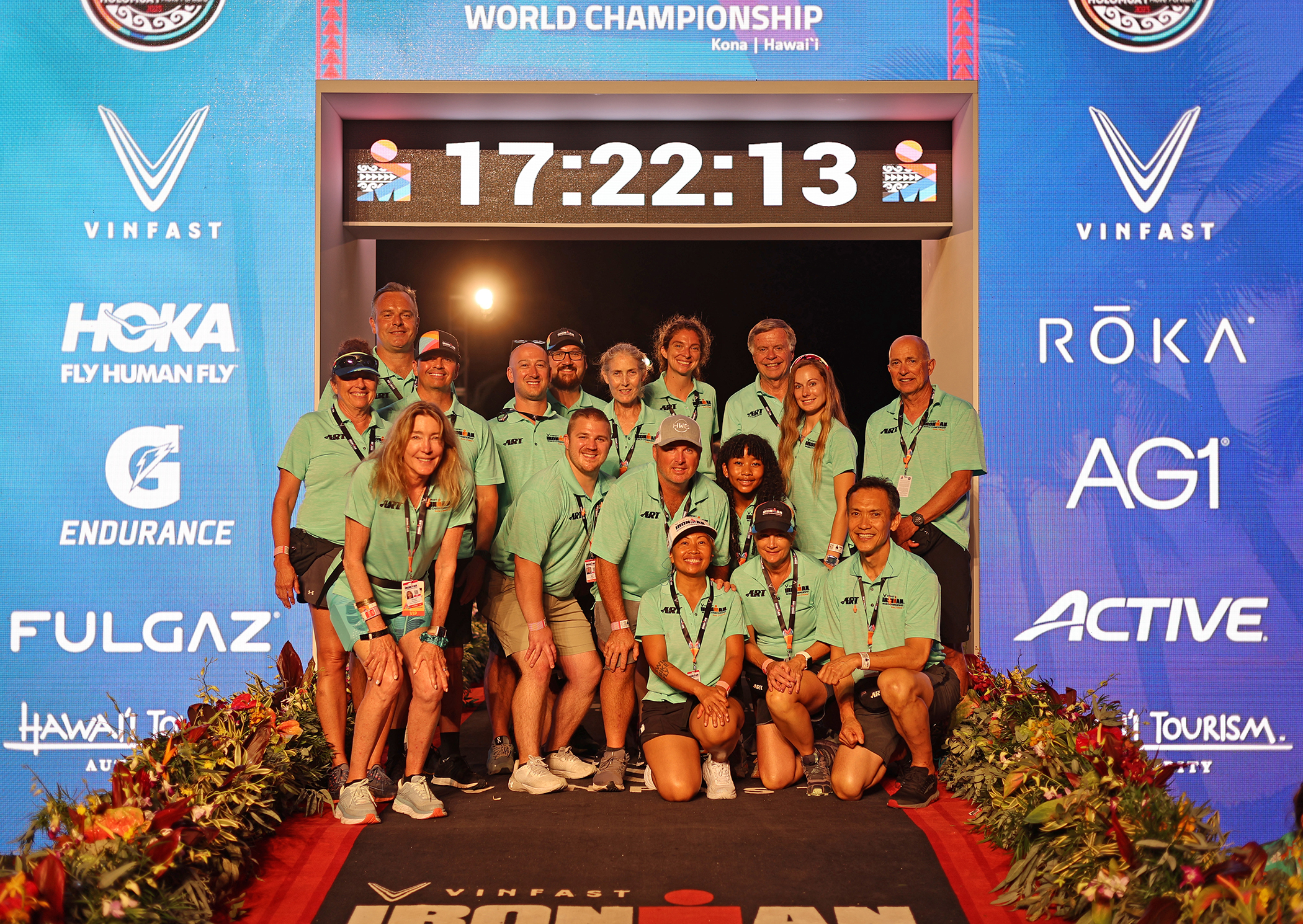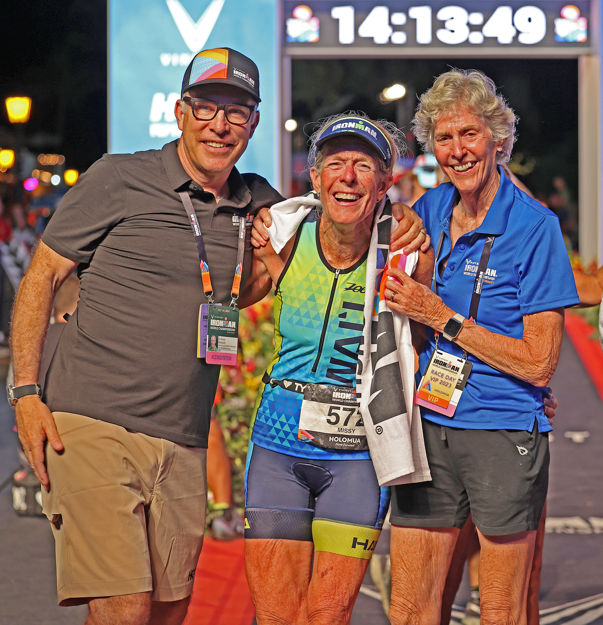 70-74 Age Group Winner Missy LeStrange (now with 18 in Kona) flanked by two retirees, CEO Andrew Messick and Cherie Gruenfeld (with 14 age group wins in Kona).