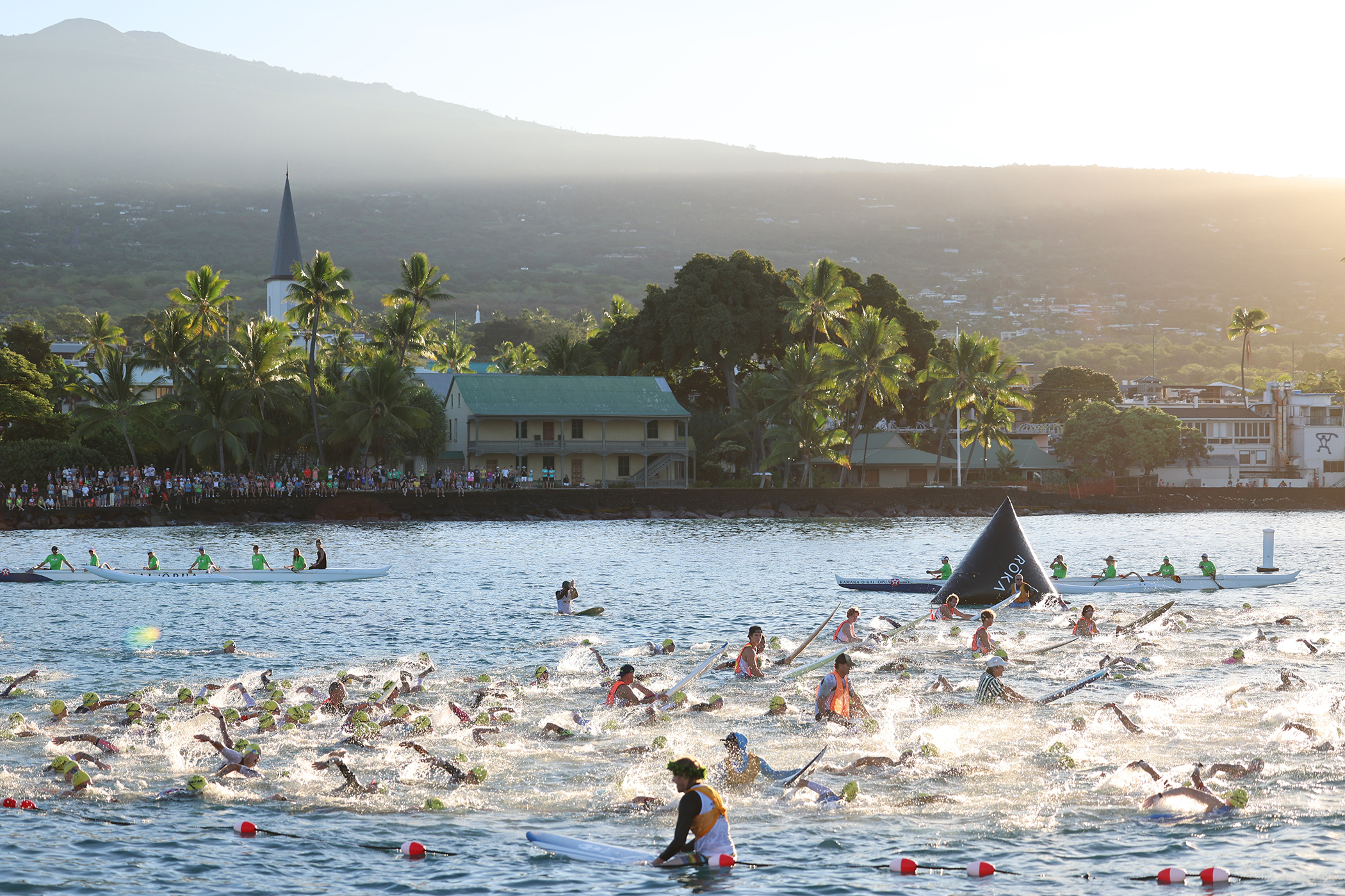 A wave start with the rising sun. Upper left is the dormant Hualālai volcano, and below Moku‘aikaua Church and Hulihe‘e Palace.